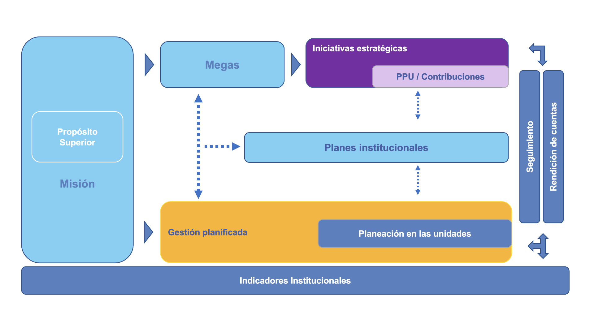 Son un conjunto de acciones planificadas y dirigidas que la universidad, de manera conjunta o en cada sede, implementa para alcanzar las Megas durante el ciclo de planeación. Estas iniciativas están diseñadas para impulsar el crecimiento, la innovación y la transformación dentro de la institución, y pueden desarrollarse a través de PPU y Contribuciones.